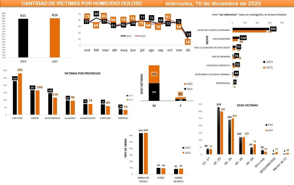 Costa Rica cierra el 2025 enfrentando el periodo más violento de toda su historia estadística contemporánea. Al 10 de diciembre del 2025, el Organismo de Investigación Judicial registra 826 homicidios dolosos, superando los 821 del 2024, cuando aún restan semanas para finalizar el año. Según el ritmo acumulado y la tendencia de diciembre —que ya suma 24 homicidios en apenas diez días—, el país se encamina a cerrar con aproximadamente 880 homicidios, situando al 2025 como el año más letal registrado, por encima de 2023 y 2024. Esta escalada, que suma tres años consecutivos con cifras históricas, coincide íntegramente con la gestión del ministro de Seguridad Pública Mario Zamora Cordero, quien asumió el cargo en mayo de 2023.